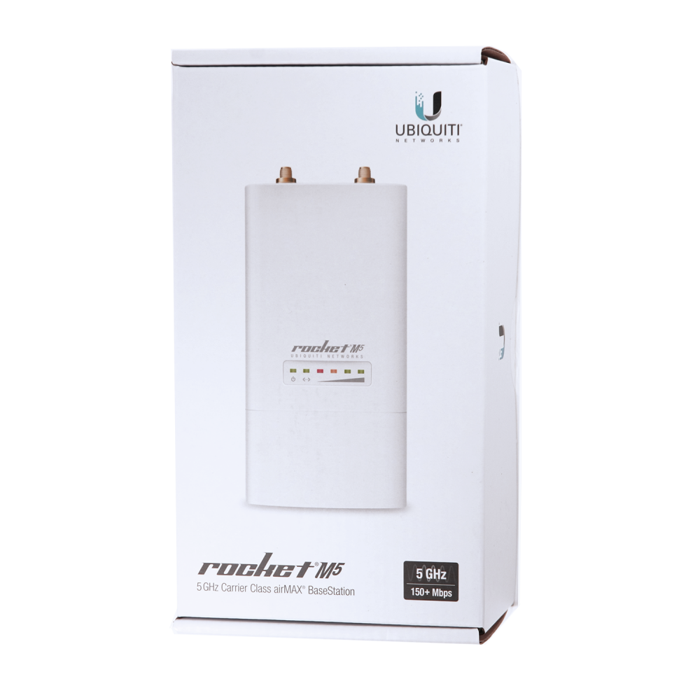 Точка доступа Rocket M5 с поддержкой PoE, работающая в диапазоне частот 5 ГГц. Модель предназначена для прямого монтажа на антенну и совместима с сериями BaseStation и RocketDish. Работа устройства основана на технологии 2x2 MIMO, обеспечивающей передачу сигнала со скоростью до 150 Мбит/с на расстояние до 50 км.